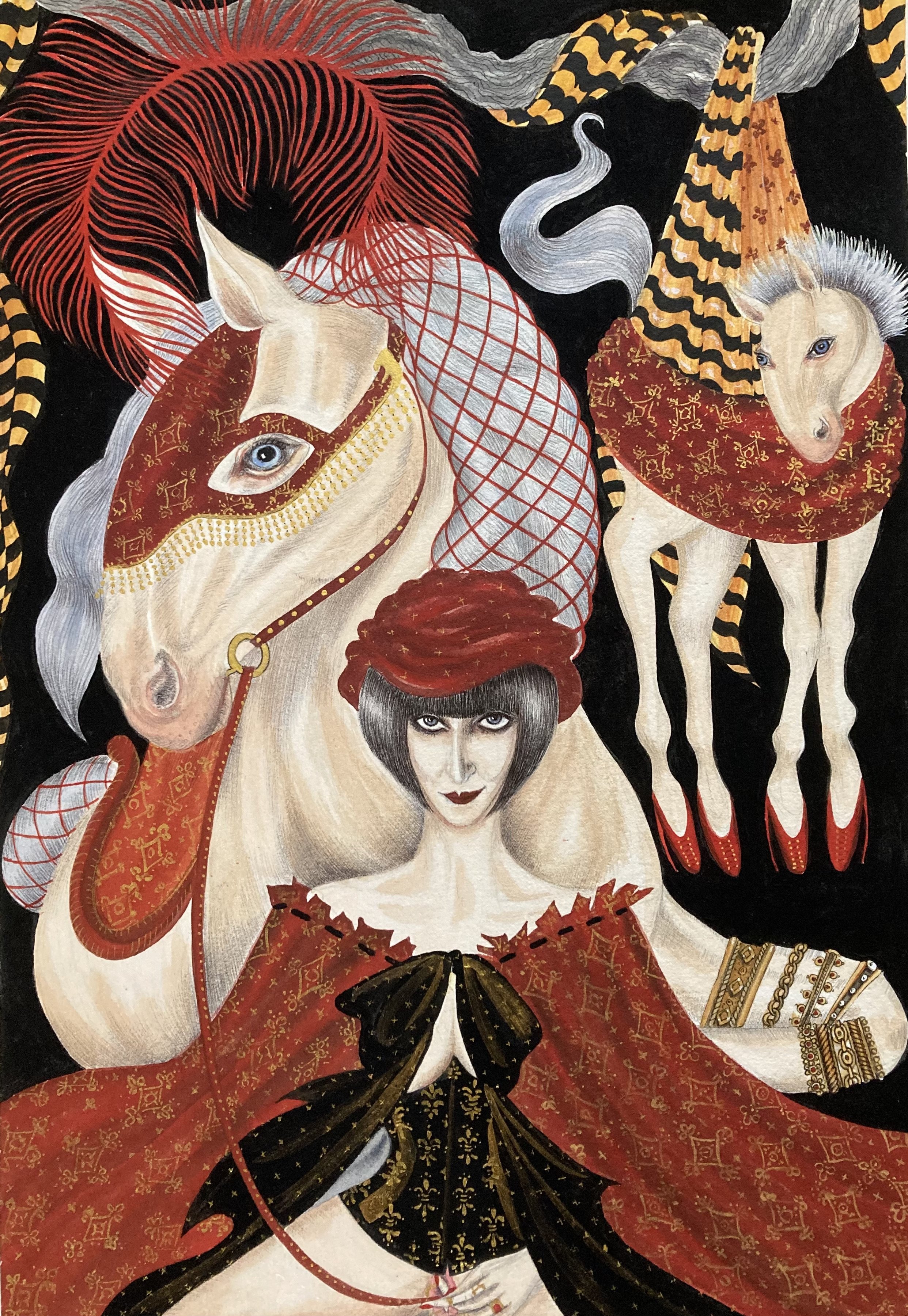 Glorious woman and her horses. Called The Muse and designed with medieval prints in mind.